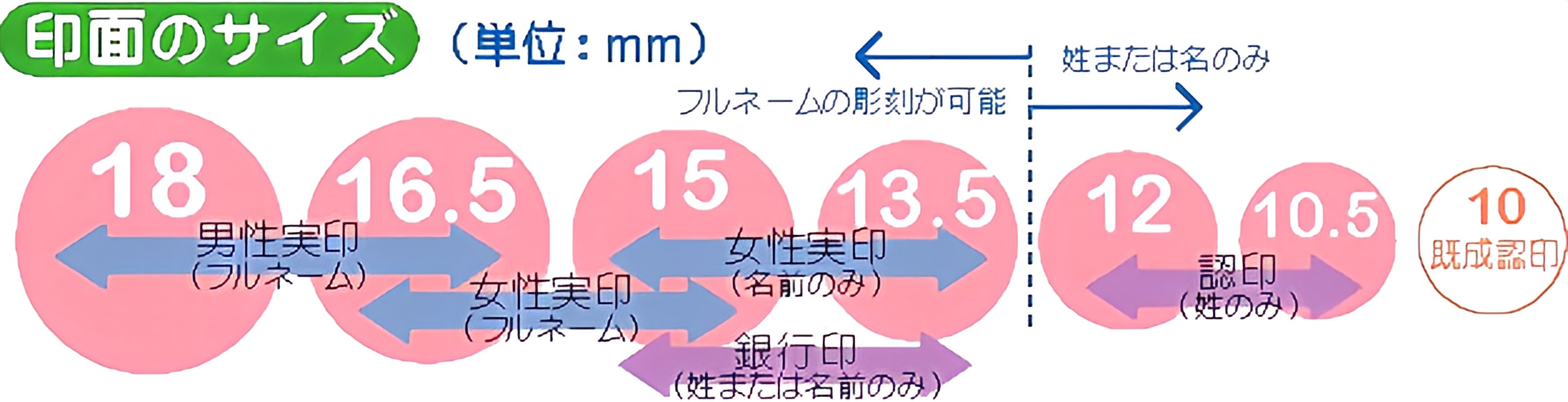 それぞれのサイズは個人の好みによりますが、印材と同様、印鑑がその人の判断材料にされる時もあるようですので、特に実印に関しては、より太く重々しいものが好まれています。(男性18.0mm・女性16.5mm)。