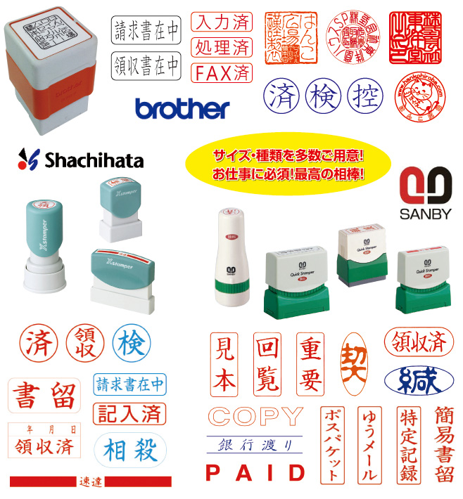 種類やサイズを多数取り揃えております。店頭にてご相談ください。掲載商品の他、各種メーカーの浸透印をお取り扱い致しております。